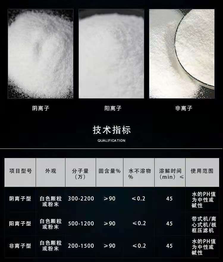 絮凝劑中有聚丙烯酰胺,而聚丙烯酰胺中有——陽離子 陰離子 非離子。 陽離子適用于濃度較高的帶正電荷的無機(jī)懸浮物,PH制為中性活堿性溶液中。 陰離子適用于帶負(fù)電荷,含有無機(jī)物質(zhì)的懸浮物。非離子聚丙烯酰胺使用與有機(jī) 無機(jī) 混合懸浮物的分離。溶液呈酸性或中性。